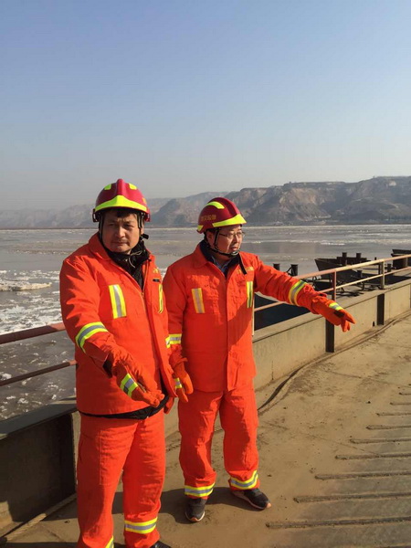 夜晚黃河橋冷風(fēng)刺骨,氣溫低達(dá)-8℃。按照總隊(duì)制定的攔截壩敷設(shè)方案,劉曉東、王和平帶領(lǐng)突擊隊(duì)員頂著凜冽的寒風(fēng),與渭南市、合陽(yáng)縣環(huán)保局工作人員一起搶卸卡車,將鋼絲繩、扳手、鉗子、活性炭包等應(yīng)急器材器具迅速配送到位,隨時(shí)準(zhǔn)備敷設(shè)攔截壩。所有人都在急切地等待著上游的監(jiān)測(cè)結(jié)果。