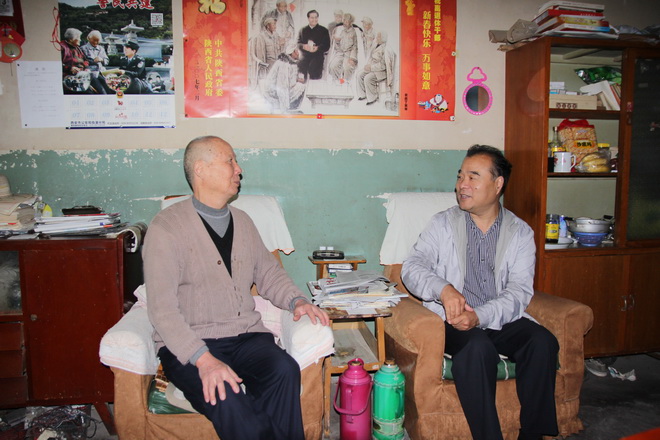 圖為隊黨委書記王戰(zhàn)社和退休職工劉明簡親切交談